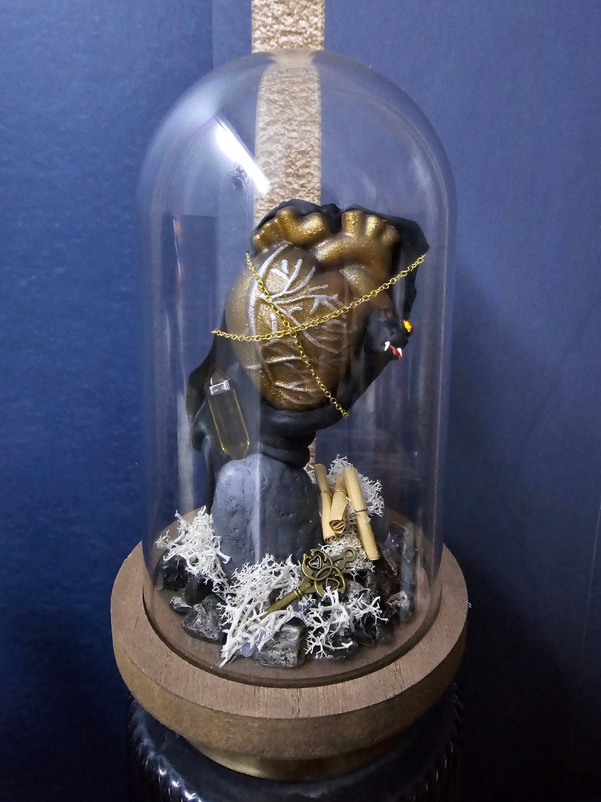 Au centre trône un cœur de dragon sculpté à la main, entouré de son univers, et d’une chaîne symbolisant la force et la magie ancienne.
